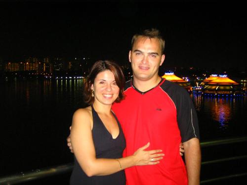Cris e Sylvain no restaurante em Cingapura