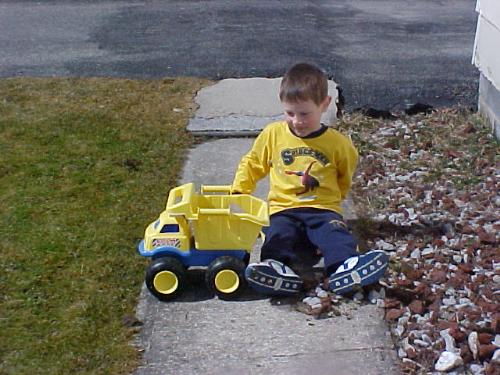 When it warms up Jacob is out side playing with his truck.