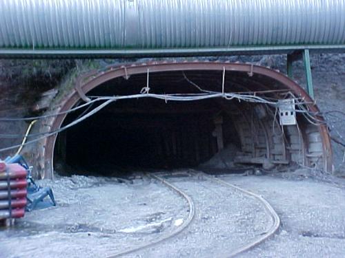 A close up of openning where men go under ground to get coal.