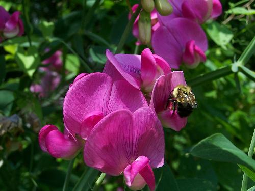 Sweet pea flower with a bee on it.