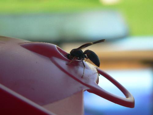 A wasp on hummingbird feeder