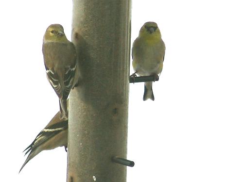 Hey what you doing over there? More signs of spring the golden finches are starting to get color..These two are wondering what I was doing one almost broke his neck looking at me..