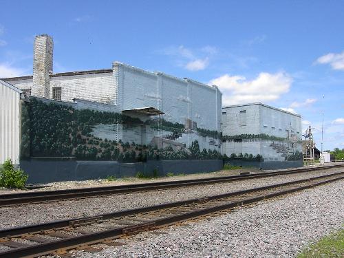 Today we look at the side of the building there's a railroad tracks and then beyound the tracks is a river. I think this mural is showing what happened on the river in the earler days.