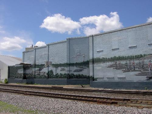 Today we look at the side of the building there's a railroad tracks and then beyound the tracks is a river. I think this mural is showing what happened on the river in the earler days.