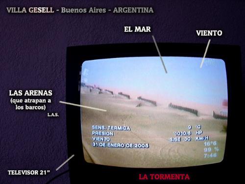 me fuí un par de dias a la costa para arreglar cosas en un lugar y al llegar me recibió tremenda tormenta, una sudestada con ráfagas de viento de hasta 70 km por hora, toda una manifestación de la naturaleza. Pero como mi lugar es cómodo y seguro y hasta podía seguir la tormenta por los paisajes de las cámaras fijas del muy buen canal local - Canal 2 - se me ocurrió esta foto del televisor. Y en casa lo de introducirle textos, que de alguna manera refuerzan el sentido de artificialidad intentando darle cierto matiz poético a la situación. |