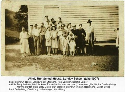 The 1889 Windy Run School (photo taken 1927) The only one room school standing and recognized by the National Register of Historic Places in West Virginia. We are part of the Windy Run Historical Association that has helped to preserve and restore this school for future generations. |