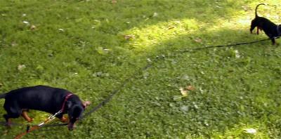 Slinky saying Pluto bring the ball back. Slinky was tugging at the tie out cable.