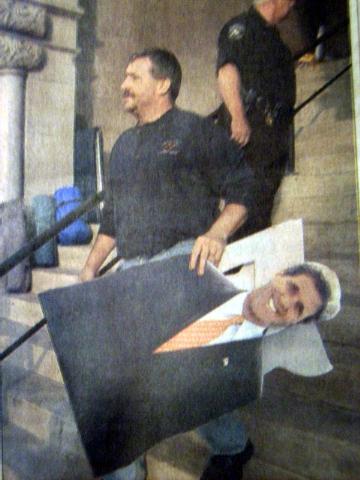 Deputies remove image of John Kerry from steps of Wood County court house yesterday. No political signs at a polling place in West Va A group of John Kerry die-hards pitched their tents Tuesday night and settled in for the night on the steps of the Wood County Courthouse. Their objective: to be the first people in Parkersburg to cast a vote for John Kerry when early voting opened Wednesday morning at 8:30 a.m. (Photo by Parkersburg News) |