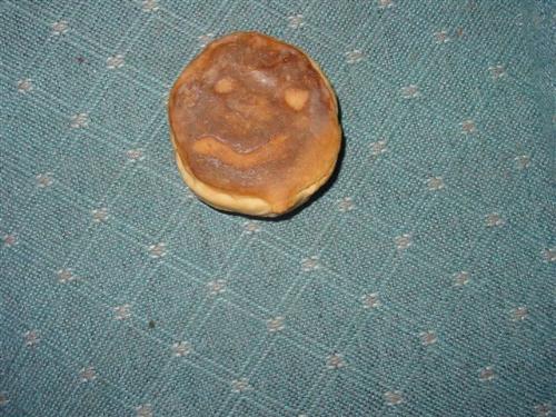 OK, it's not the Virgin Mary on a tortilla - but in 1989 one of my sister's pop-up rolls came out of the pan with a happy face, and no human intervention!! - she preserved this miracle in lacquer and keeps it in a glass container (with lid)so this is how it appears today. |