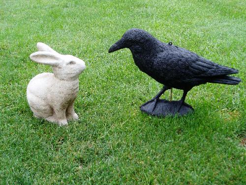 Several times in the past 2 months, some very late night marauder has "violated" my front yard crow - 4 times it was moved to a neighbors lawn or porch, once replaced by a pinwheel...but located later, a few times just moved around my yard - but yesterday's early morning discovery made me laugh out loud - a life-size cement bunny was left nose to beak with Crow...no doubt Bunny was removed from someone elses yard. What next? |