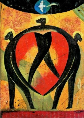 I found this marvelous depiction of the Holy Trinity (note the halos)by Nichaolas Winton in an old (January 2001) issue of "Guideposts" magazine as the illustration for an artticle called "the Power of Love".