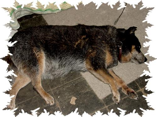 This is Tasha, the blind 13-year old Heeler. Taking a "flop nap".