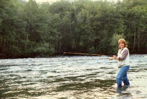 Mom would kill me, but her she is, surprised by my stepdad (who is great at suprise snaps), fishing enthusiastically in the Klamath River - she was in her fifties! She doesn't look it though. But she would still kill me for telling!