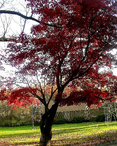 I hung on in the aimless winds of fall, Exposed to sun and rain, I turned to red; Then letting go and drifting on the truth, A clinging scarlet leaf at last was shed.