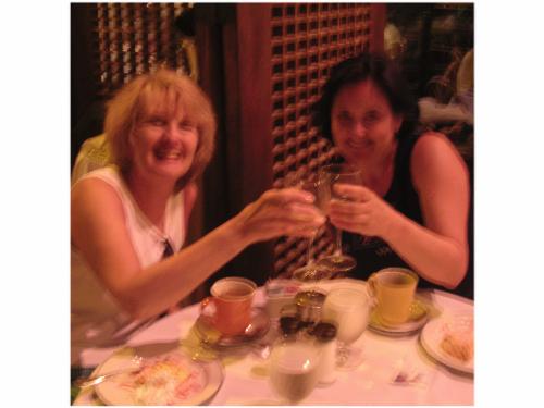 okay - here's one from last week - nice and blurry - a waiter took it My friend Ann (left) and me (right) in Aruba You see I am really extremely camera shy I like being on the other end I often don't even allow people to take my picture I'm feeling brave tonight |