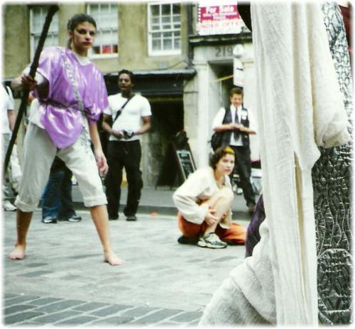My first trip out of my country was to see my daughter Jen perform in the Fringe Festival in Edinburgh Scotland. I lost most of the snaps of her in this (long sad foto story). Here she's part of a street performance. She's the one crouching down in the back - not the one in the purple |
