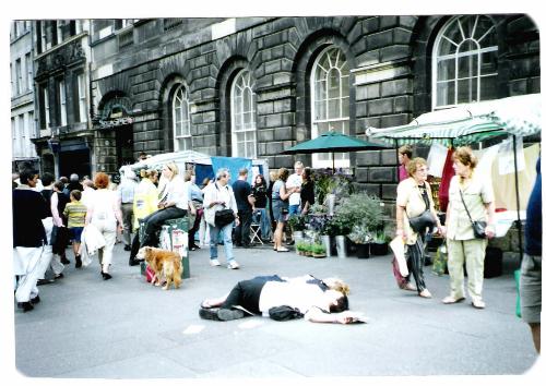 People will do anything to hand out flyers for their play. Like lie in the street looking dead, sometimes bloodied. As you can see, you get used to it and ignore them. If I wanted to see a play, I'd just take a flyer from a dead guy's hand. |