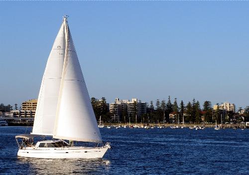 Sailing South at sunset wonder where he is going. Sydney Harbour near Manly.