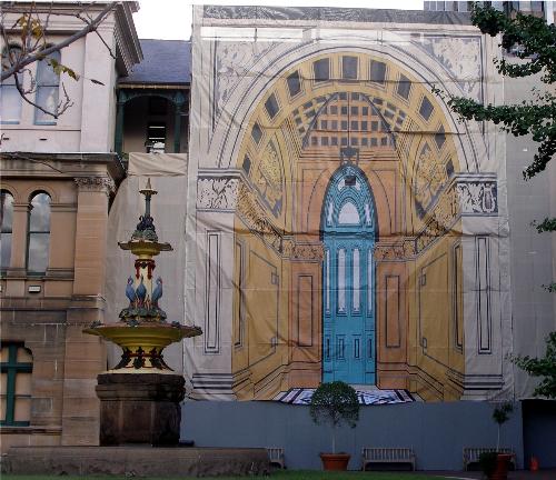 This appears to be a temporary hanging of paper or cloth showing what is being built in this space at the Sydney Eye Hospital.