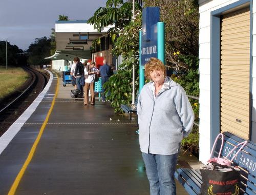 Joy on Coffs Harbour Railway station at the beginning of a nine hour journey to Sydney for check-up.
