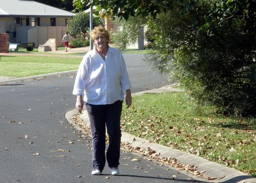 Joy on her daily walk. Took her into town on the bus this morning. Did the shopping together then home. She had blisters on her feet they were so soft.