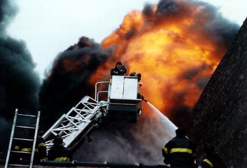 About 8 years ago. Fire was at 400 North Pulaski in Chicago. This picture was taken about 5 minutes before the building blew up. No one was hurt but I have to believe the guys in this photo thought the end was near. |
