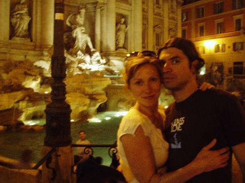 Trevi fountain at night with a full moon above.