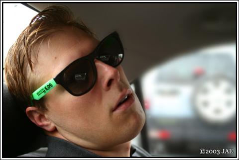 still posting from the archives...One of my buddies from work. This was his "tragic" pose with some of those rubbery kids sunglasses that were in the back seat of the driver's car...they belonged to the drivers kid.