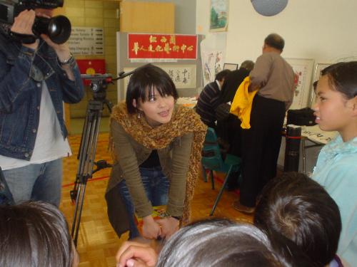 tv crew interviewing some children at the chinese moon festival.
