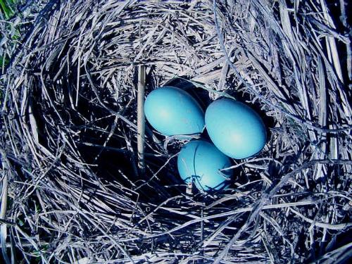 While mowing I found this robins nest on the ground. Blown down by the wind. The eggs were scattered but not broken. I put it back in the tree but the parents probably abandoned it. |