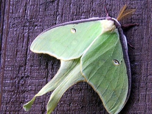 If you see a fluorescent green, large moth in the moonlight, it's probably a Luna moth. Look quickly, the adult Luna moth only lives for a week. The Luna moth is a type of giant silk moth fantastically colored pale green with a green, brown, and white "eye" on each of its wings. It has long, sweeping lower wing-tails. The moth’s wings span from 3 to nearly 8 inches across. Check out their featherlike antennae and soft long-haired thorax (body). You’ll find them in almost any area with deciduous trees, hanging out near lights at night.