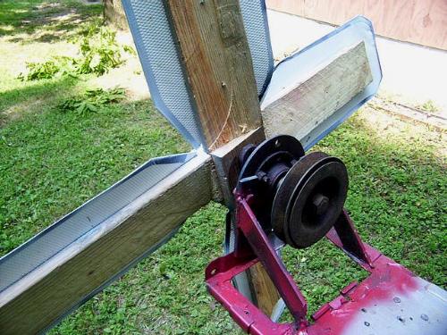 Rear view of my Rube Goldberg device. Made from lawn mower and storm door parts.