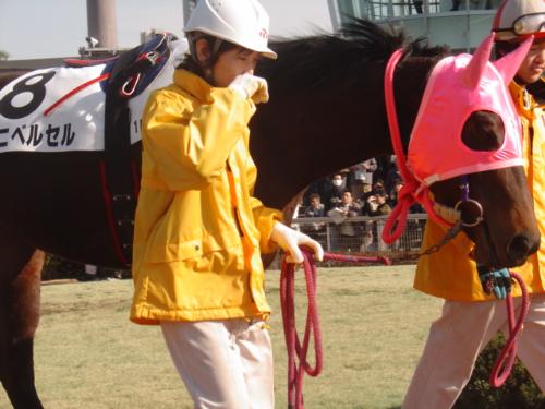 a horse accompanied by a stable woman. She-stableattendats are not so common yet here in Japan.