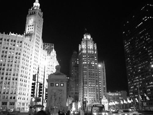 A classic Chicago view: the Wrigley Building is to the left and the Tribune Tower is the Gothic Revival Building on the right with the lighted top.