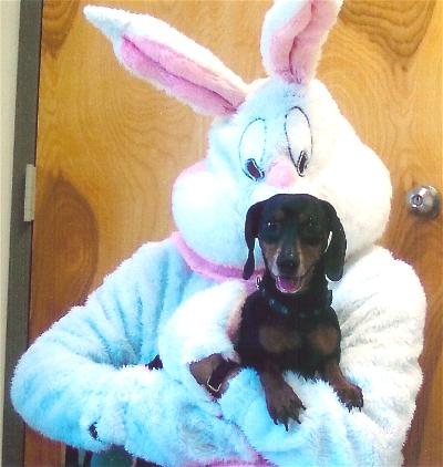 Pluto with the Easter Bunny at another fundraiser for our new Animal Shelter.