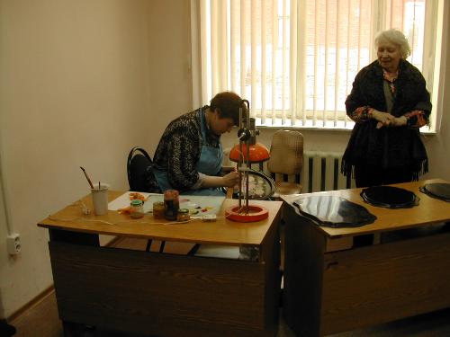 Russian ladies at work painting the beautiful lacquered trays, eggs, and other decorative accessories. The next picture will show one of the beautiful trays.