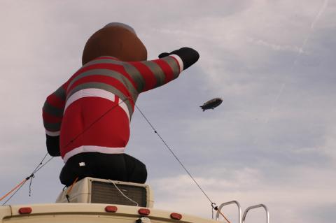Brutus Buckeye waves down the Goodyear blimp at the Ohio State versus Wisconsin game in Columbus Saturday. Or, maybe Brutus could be gesturing 'I'm open' to help out the Buckeye's struggling passing game. Met OMOM and crew and tailgated. Great time in spite of the outcome on the field. |