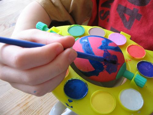 26.03.2005 " De echt decoratie begin.." " Eegs decoration begining..." " Comienzo decoración de los huevos ya teñidos de rojo y cocidos.." Amsterdam, Nederland