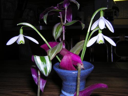 Snow on the Mountain or Snow drops. These sweet little things come up with snow all around them. The flower opens during the day and closes into a white drop at night.