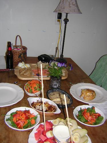Organic and healthly, Stuffed Chicken breast with spinish and fetta cheese, spinish salad, veggie dish, fruit and stuffed progies with butternut squash and portabella mushrooms...and yes dark beer, Porter!