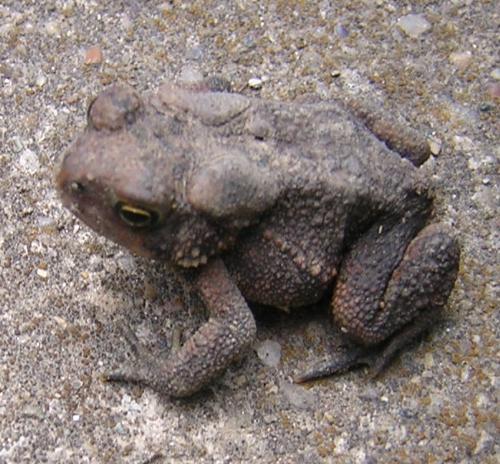 This is an American Toad. They live in gardens all over America. This little toad is about 2 inches long and maybe an inch high. I cropped it so you could see the detail. There is a pic of a full grown American Toad,it is in my archives. |