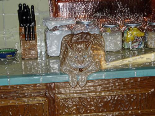 I think a way to keep the kitchen and the cat clean is to wrap the whole kaboodle in plastic. No more shedding, or dirty dishes.