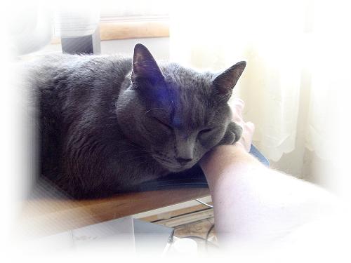 Jesse decided that he HAD to sit with me, then he LAID on my hand which was on my mouse. HE FELL ASLEEP!