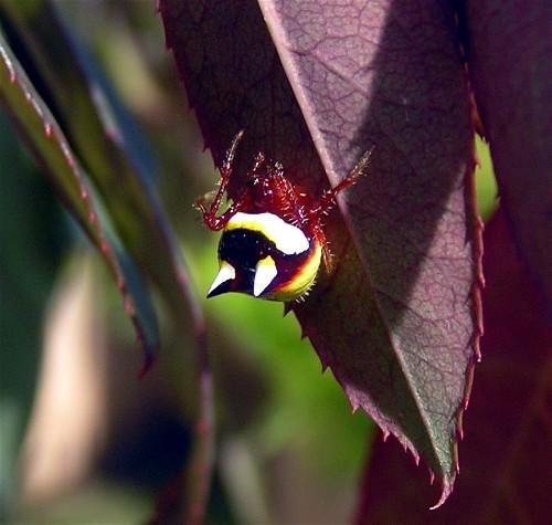 Cross between Catwoman and Spiderman. I was pruning the climbing rose and saw this creature.
