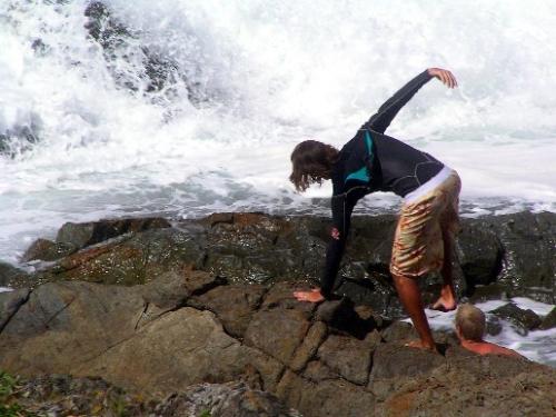 Here, grab onto my leg there's another big wave coming.The rocks he was washed off are the ones on the left. He was washed over the next rocks and the suction will take him back against the rocks on the left. The resuer tries to help.
