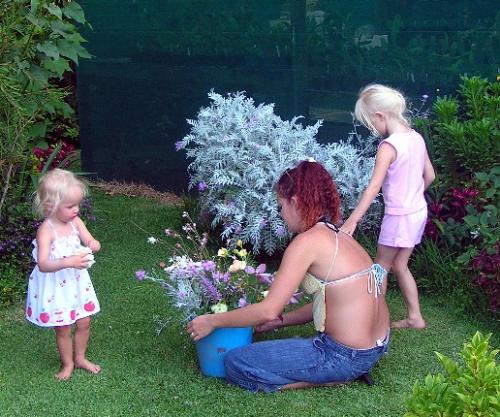 Our two other grangdaughters right and our great granddaughter left. When they visit they collect a bucket of flowers to take home.