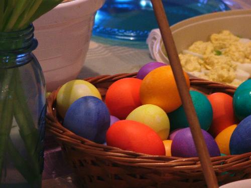 these hardboiled eggs had a hidden purpose: we were to each select one, and then smack it against our neighbor's to see which one cracked. whoever had the egg that didn't crack, won. (not that there was a prize.) |
