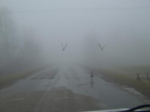 It wasvery foggy driving to Trina's this morning. I rounded a curve and met about a hundred Canadian Geese.