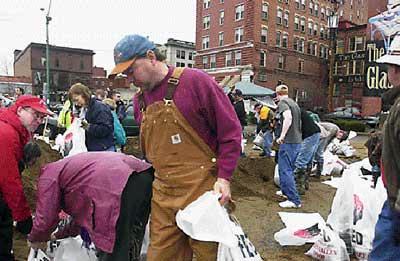 Hundreds of volunteers worked Thursday to fill sandbags for area residents and business owners in anticipation of another massive flood at Marietta. Water was covering Front Street at 6 A.M. this morning. |