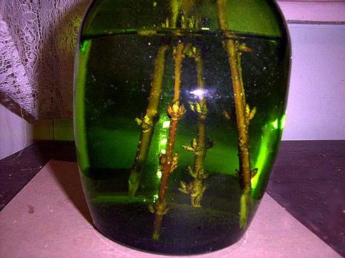 Forsythia stems in green bottle.